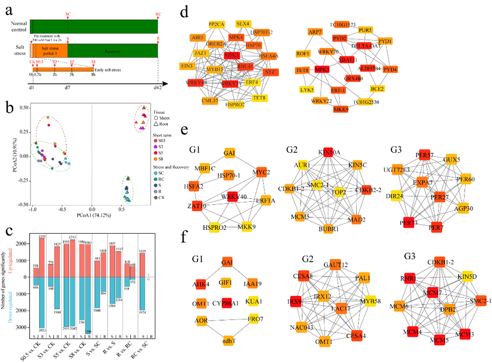 全球每年约有10%的土地面临盐渍化威胁,我国盐渍化土地约15亿亩。山东盐碱地889万亩,其中,黄河三角洲地区盐碱地占698万亩。柽柳(Tamarix chinensis)具有较高的耐盐碱胁迫能力,是黄河三角洲滨海盐渍湿地生态系统的重要树种。由治理盐碱地适应植物,向选育耐盐碱植物适应盐碱地转变,是挖掘盐碱地开发利用潜力的战略举措。杨克强教授团队利用PacBio和Hi-C测序技术,从头组装了柽柳染色体水平的基因组,对柽柳水培苗盐胁迫处理和恢复阶段的根、茎组织进行了转录组分析。测序组装的柽柳基因组大小为1.32 Gb,scaffold N50达110 Mb,99.53%的序列定位到12条染色体上,基因组完整度达97.4%,基因组QV达39.03;基因组包含24,211 (91.62%)个可注释的编码基因。进化分析显示,柽柳在早第三纪(Palaeogene)的3,988 ± 1,295 万年前发生了全基因组复制(WGD)事件。WGD和串联重复(TD)基因与柽柳对盐胁迫的适应性相关,HAT和LIMYB基因家族成员显著扩张(图1)。盐胁迫和恢复阶段根和茎组织的转录组分析表明,在盐胁迫条件下,根和茎呈现不同的基因表达谱。Hub基因分析显示,WRKY33/40、MPK3/4和XBAT31基因在盐胁迫早期响应中起关键作用,WRKY40、ZAT10、AHK4、IRX9和CESA4/8基因在胁迫后期和恢复过程中参与柽柳盐胁迫响应,编码III类过氧化物酶的PER7/27/57/73基因和编码DNA复制执照因子的MCM3/4/5/7基因在盐胁迫和恢复阶段保持上调或下调表达(图2)。研究组装了高质量的柽柳基因组,揭示了柽柳基因组进化特征,挖掘了柽柳耐盐关键基因,为柽柳抗盐遗传改良和抗盐基因利用提供了基础。